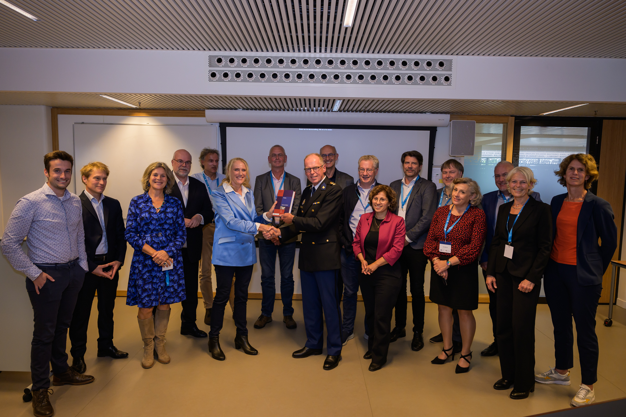 Na het officiële gedeelte volgde een afsluitende netwerkborrel, waar deelnemers zoals politieagenten, studenten en wetenschappers in een informele setting met elkaar in gesprek konden gaan. Dit bood niet alleen de kans om ervaringen en ideeën uit te wisselen, maar ook om nieuwe samenwerkingen te verkennen. Als hoogtepunt van de middag werd de vierde druk van het Handboek Politie symbolisch overhandigd aan Leonard Kok, directeur van de Nederlandse Politieacademie. Met deze nieuwe editie wordt er bijgedragen aan de versterking van de Nederlandse politiepraktijk en een solide basis leggen voor toekomstige generaties politiemensen en onderzoekers.